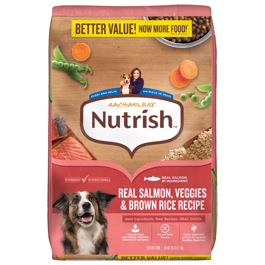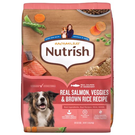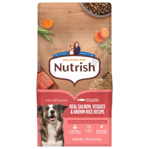 Rachael Ray® Nutrish™ Adult Dry Dog Food Real Salmon, Veggies & Brown Rice Recipe is dry dog food for adult dogs crafted for all breed sizes. Made with real salmon as the #1 ingredient, this salmon dog food recipe is a delicious recipe that even picky eaters enjoy finishing. This natural dog food with added vitamins, minerals & nutrients offers real ingredients your dog will love.